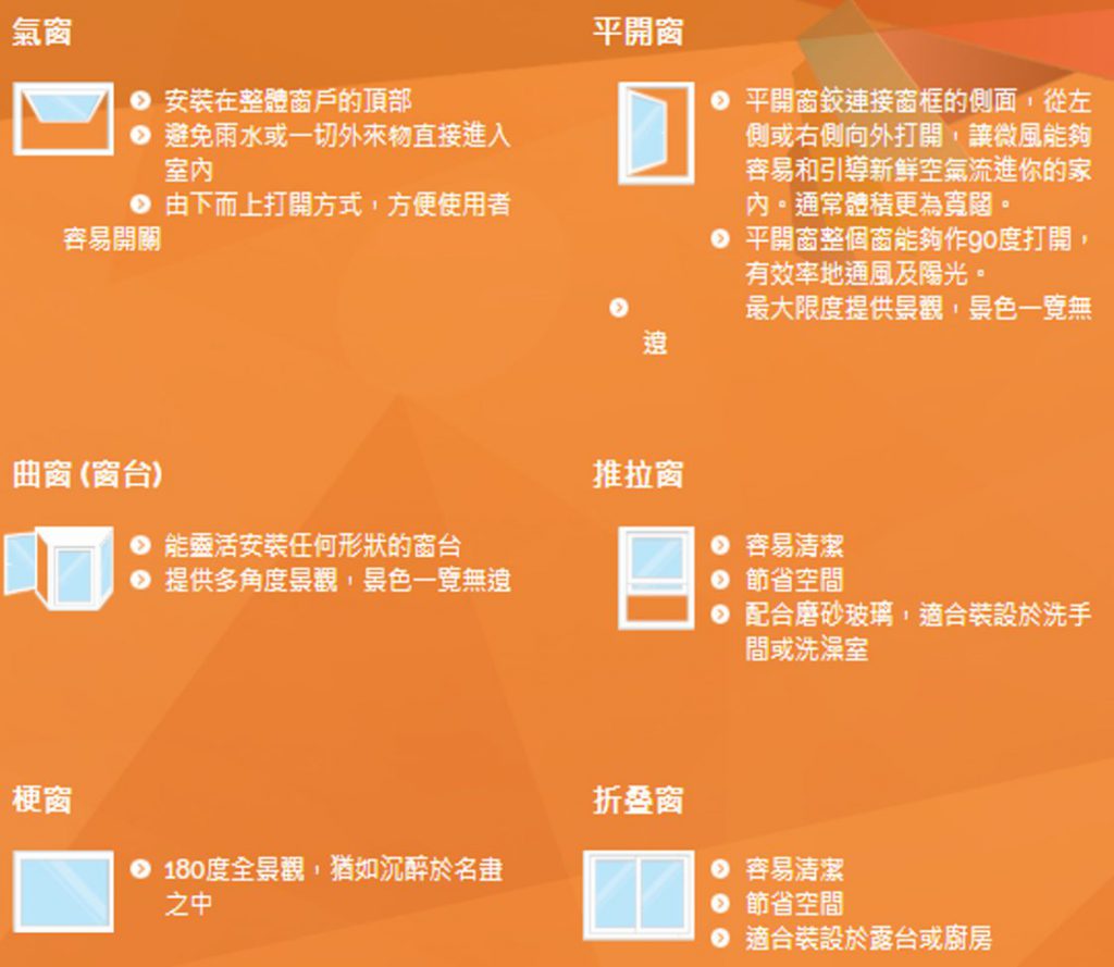 除鋁窗外亦有各式鋁趙門,鋁趙摺門,鋁掩門及各式不鏽鋼閘門,蚊網及窗花,滿足顧客不同需要。